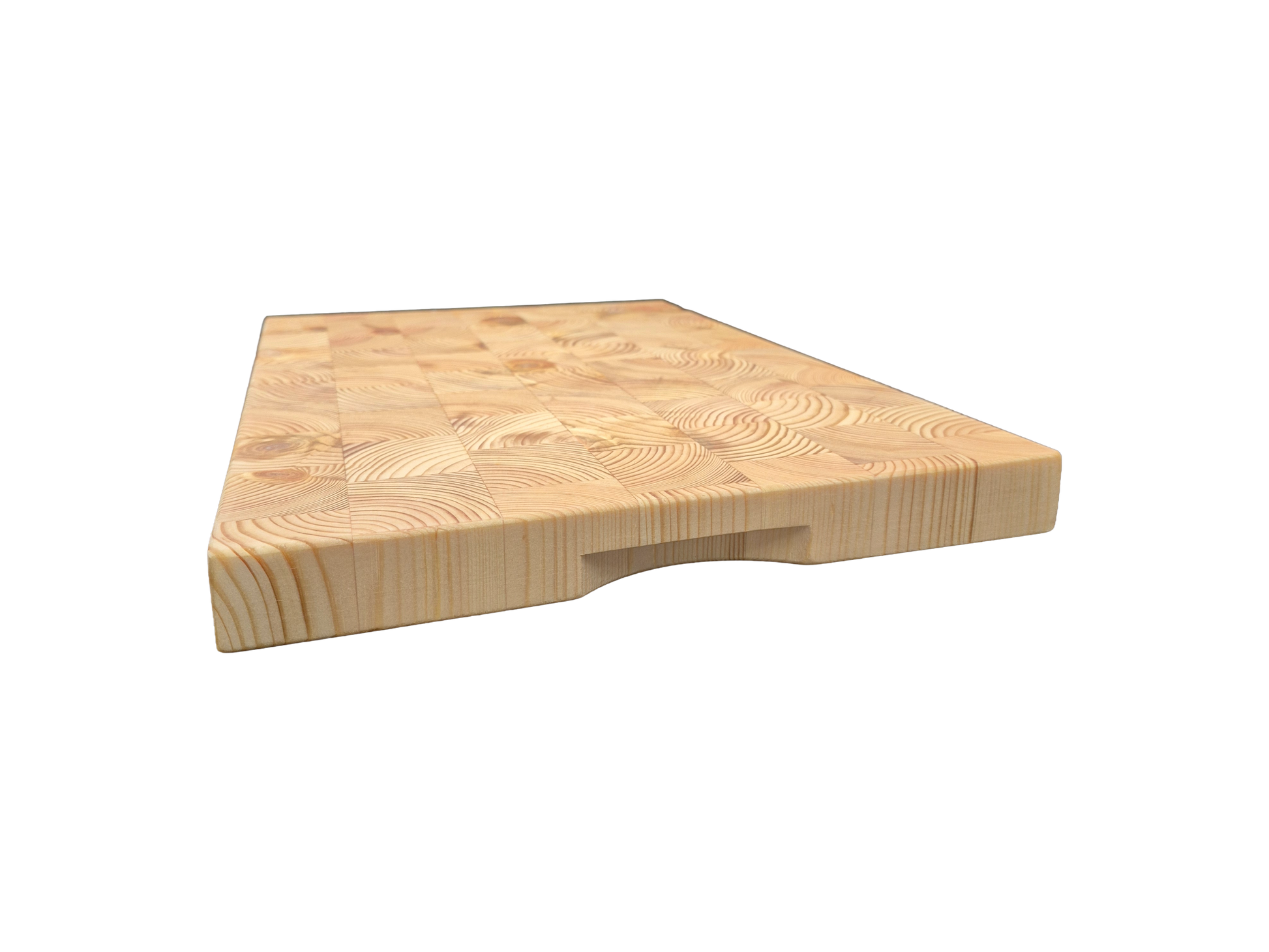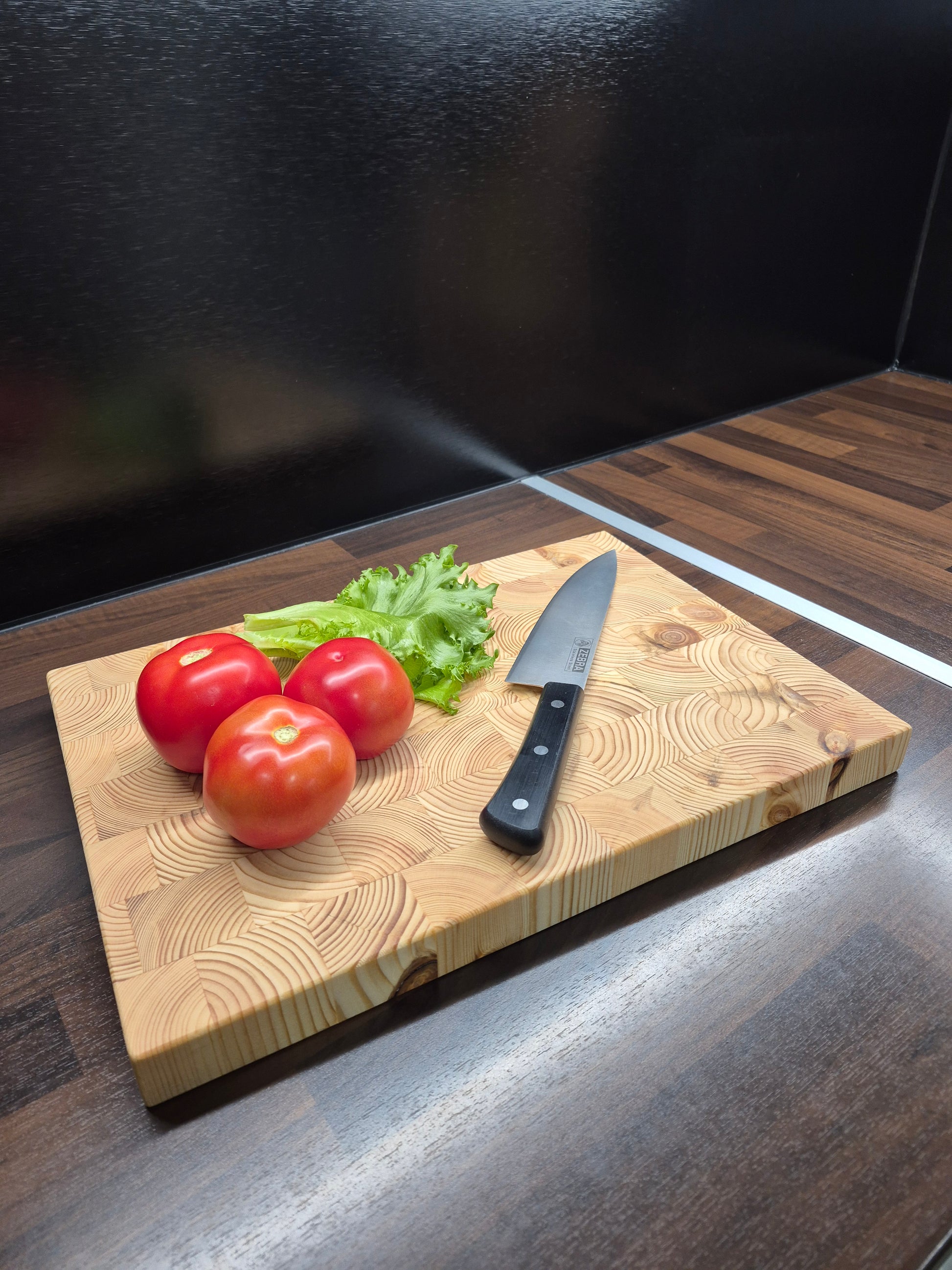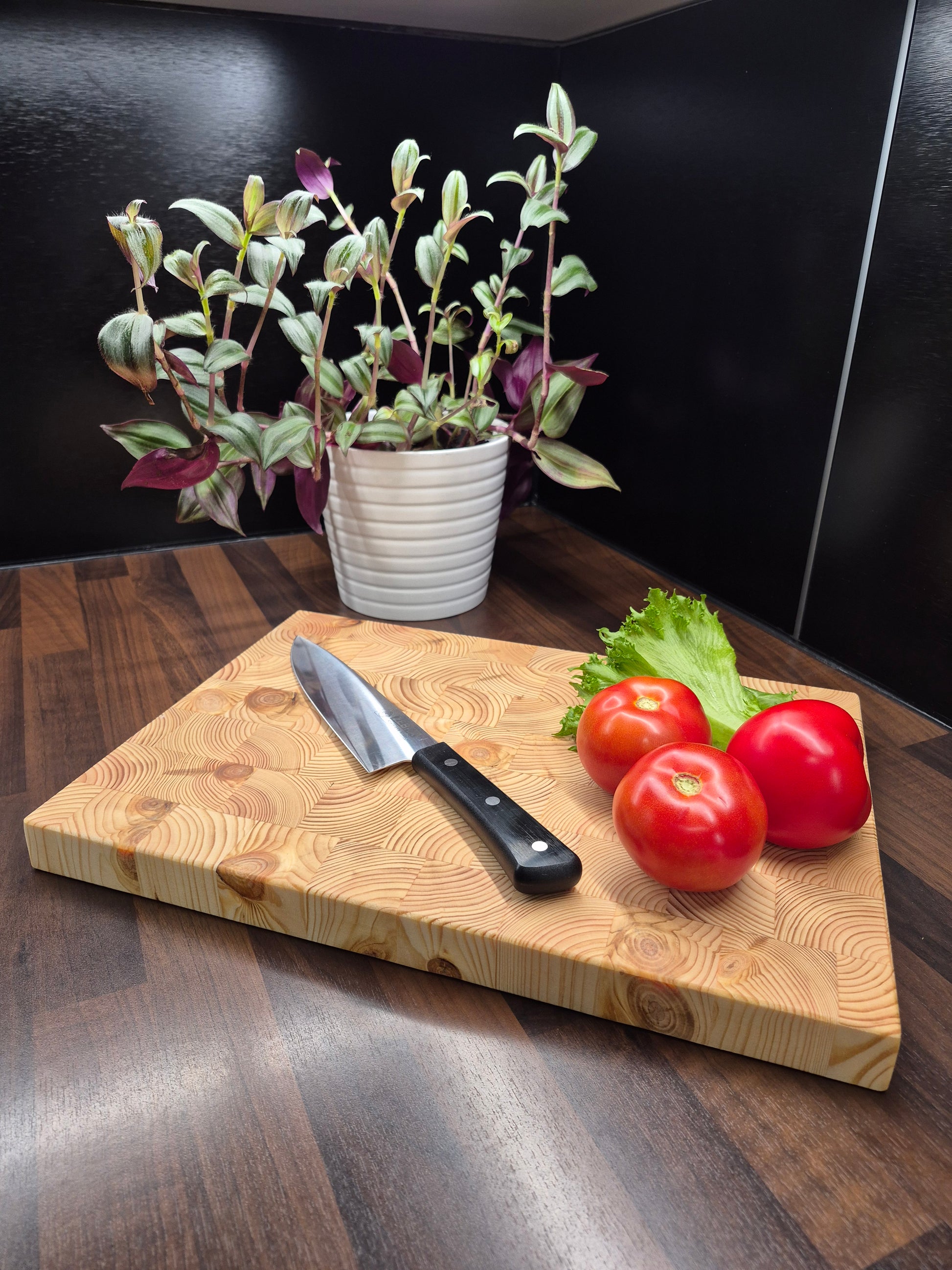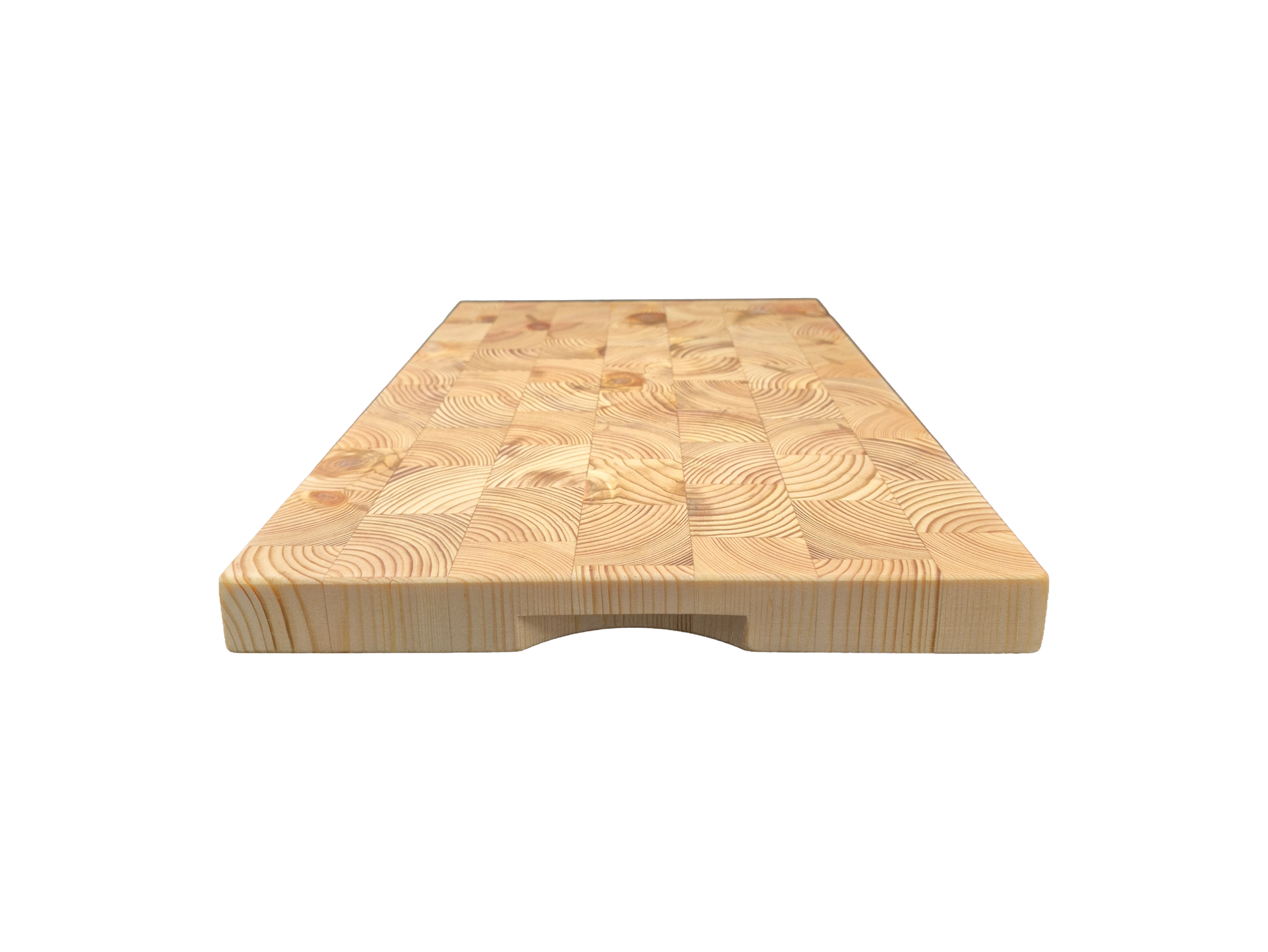 Suomalaisesta männystä käsityönä valmistettu päätypuu leikkuulauta tuo keittiöön lämpöä, tyyliä ja ripauksen metsän tuoksua. Jokainen lauta on uniikki, ja siihen saa halutessaan oman logon tai viestin painettuna.